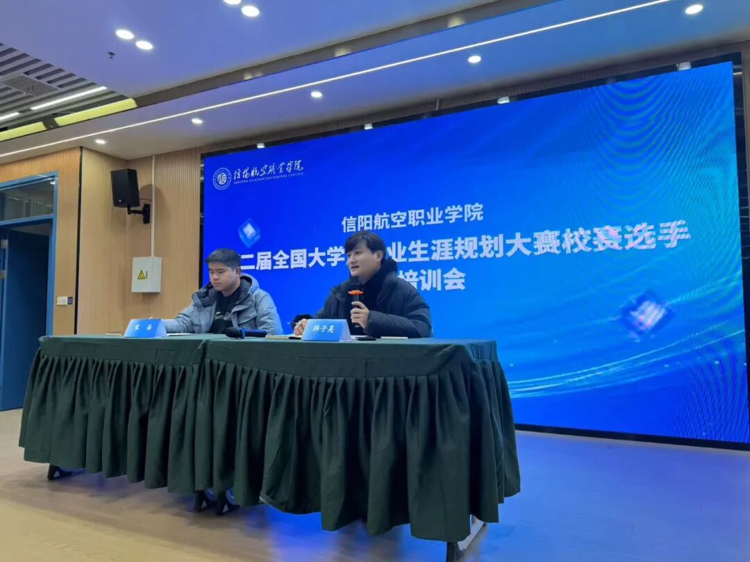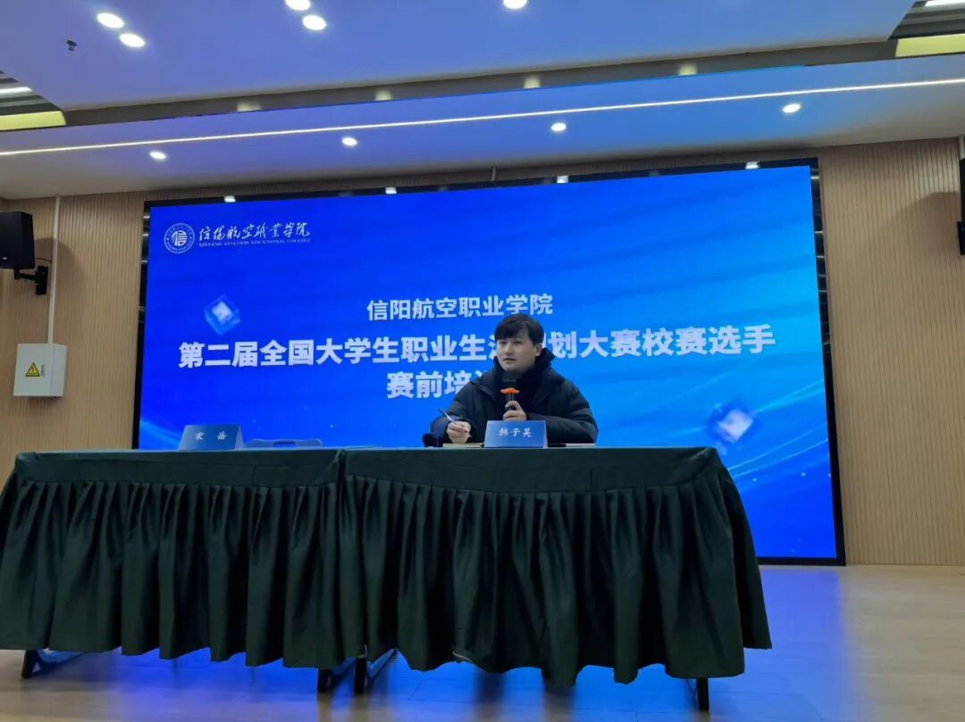 2024 年 12 月 19 日晚 6 点,信阳航空职业学院在马克思主义学院 401 教室顺利召开了第二届全国大学生职业生涯规划大赛校级选拔赛赛前培训会。此次培训会由校团委和招生就业处共同举办,吸引了来自各二级学院的 68 名选手积极参与。